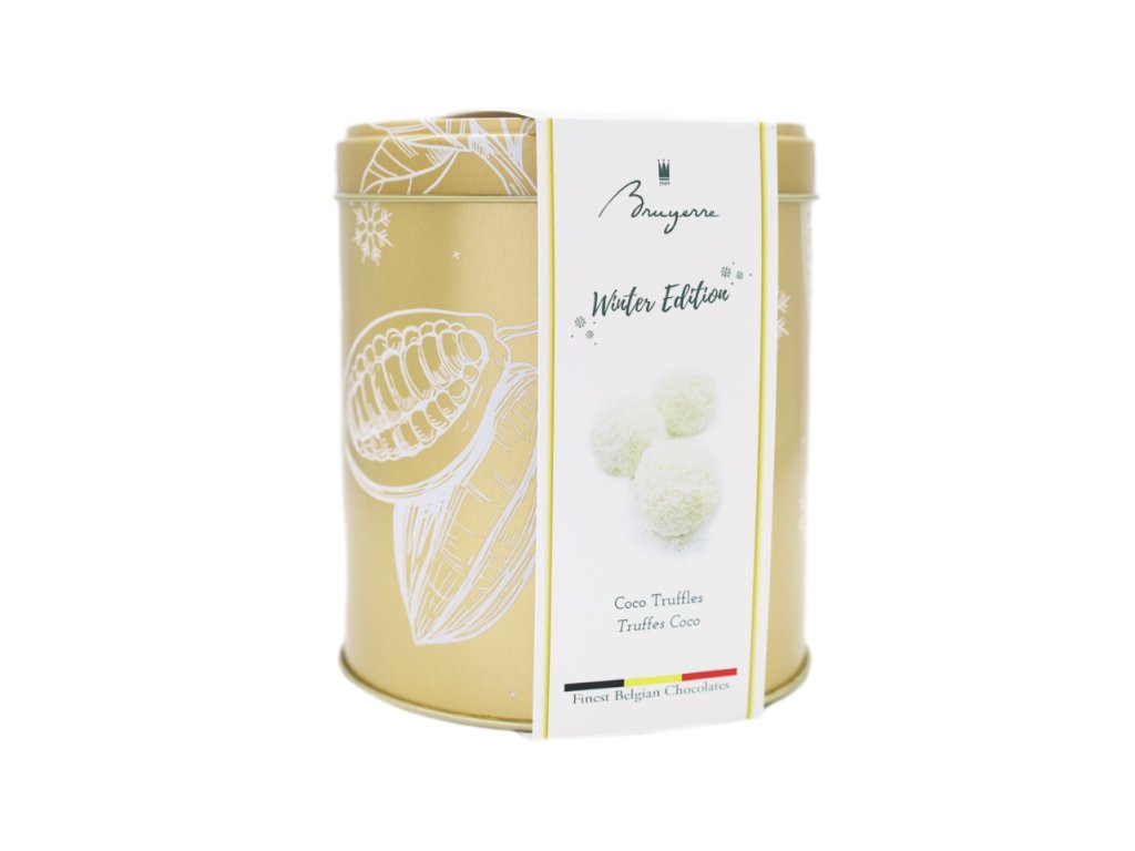 Dárková plechová dóza s vánočním motivem plná belgických Truffles s kokosem.
