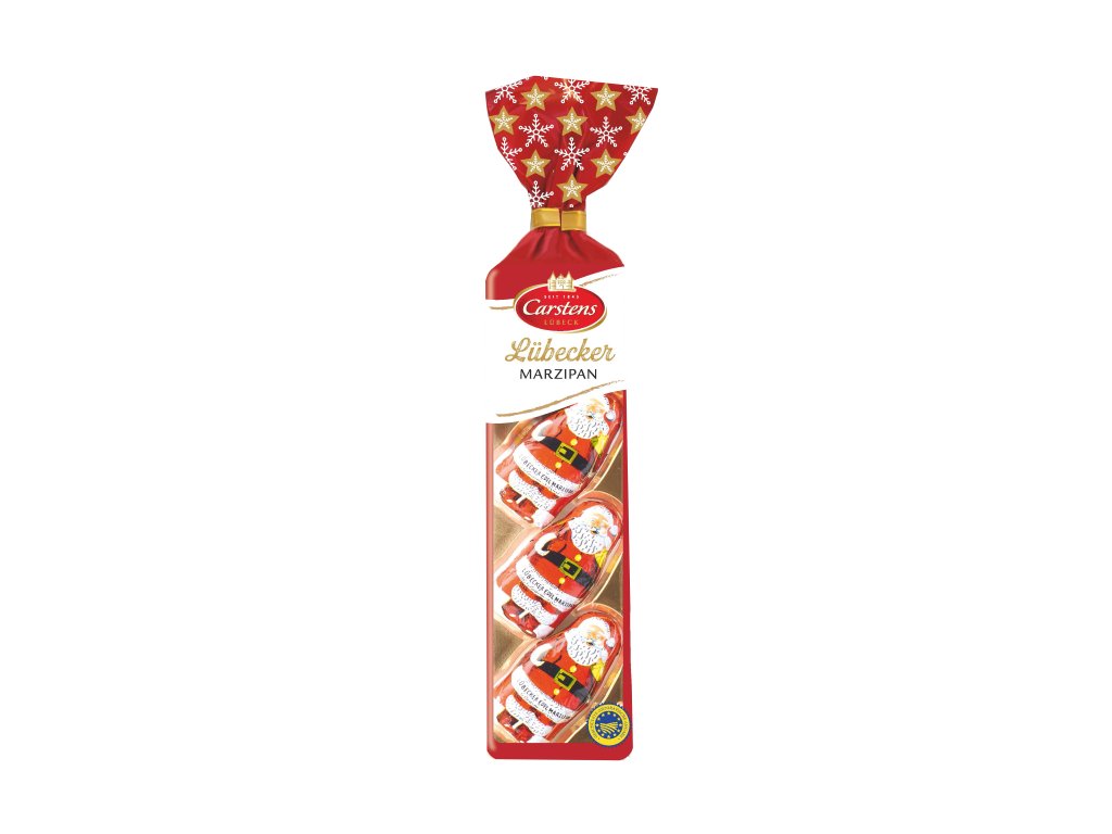 Lübecký marcipán (76%) v hořké čokoládě (24%) v dárkovém balení ve tvaru Mikuláše.