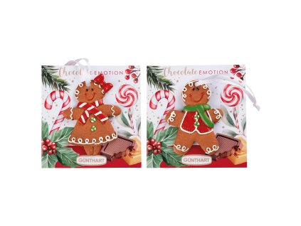 Mléčná čokoláda plněná nugátovým krémem (43,5%) s dřevěnou dekorací ve tvaru Pana Perníčka a Paní Perníčkové k zavěšení.