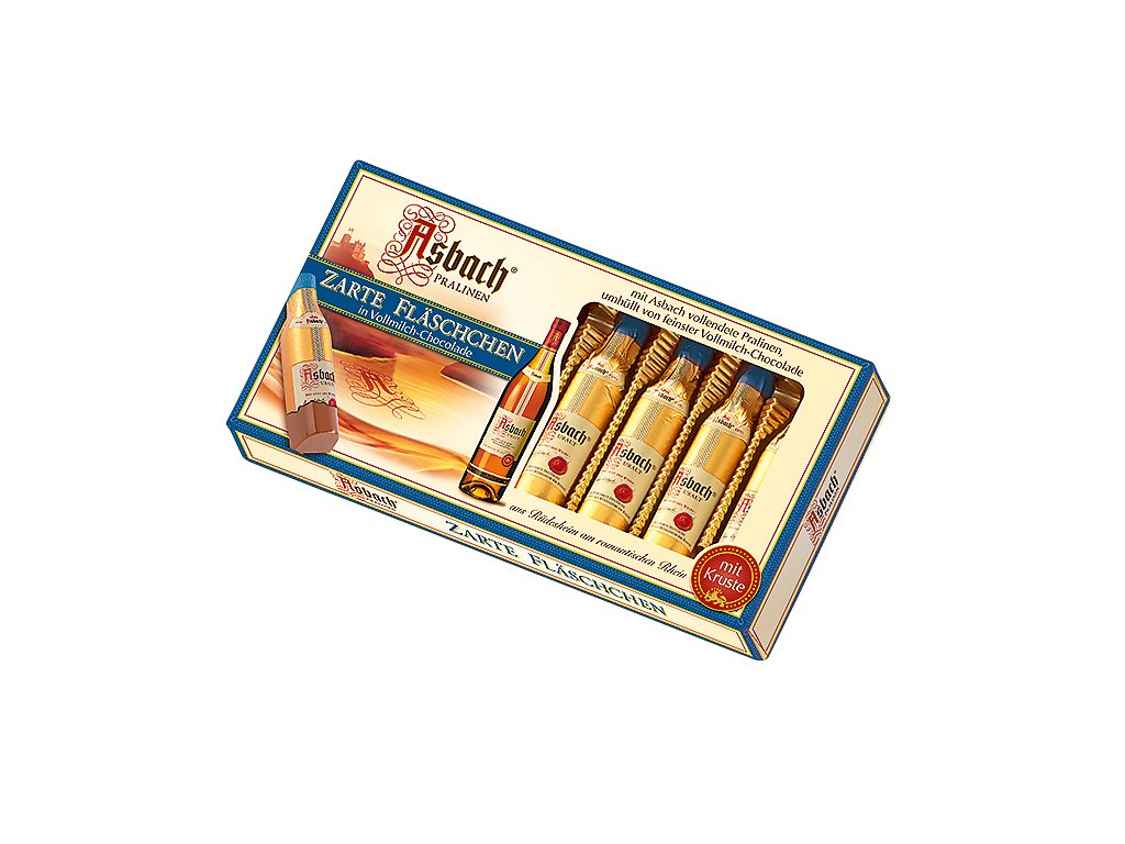 Lahvičky plněné známou jemnou brandy Asbach (8 kusů), uvnitř cukrové krusty a jemné mléčné čokolády,