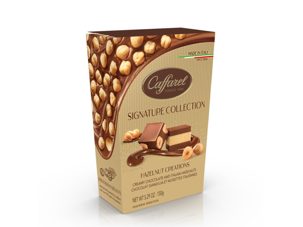 Krémový mléčný a lískooříškový gianduia nugát s vysokým podílem lískových oříšků a lahodný gianduia nugát s celými piemonte lískovými oříšky.