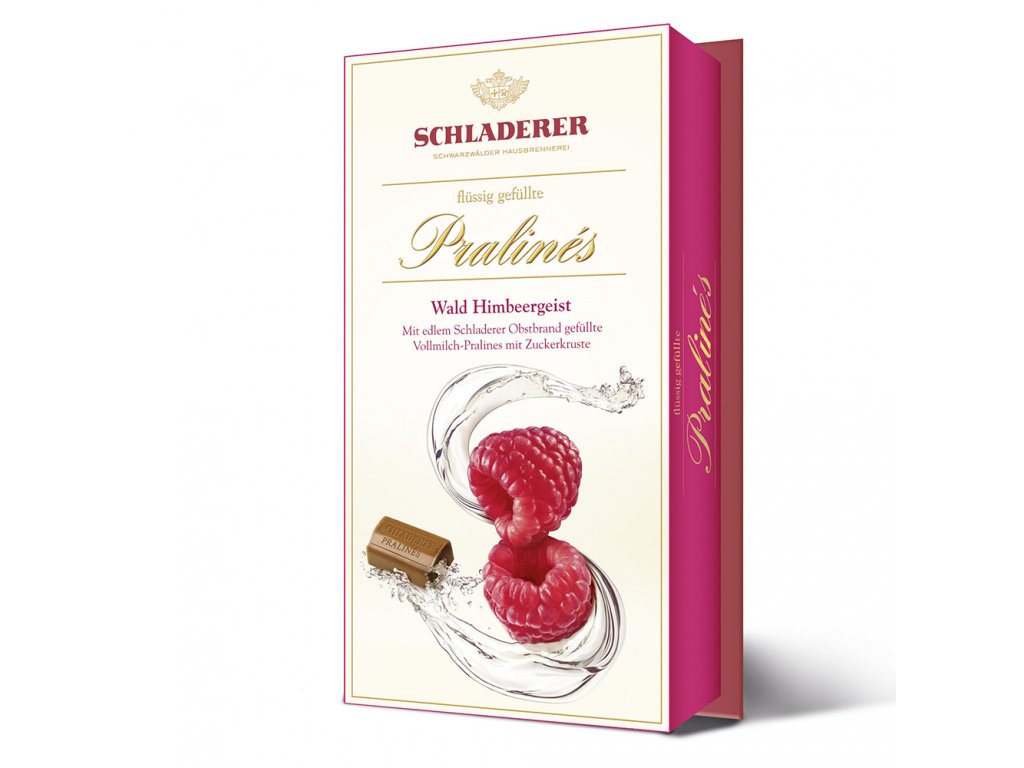 Jemná Schladerer ovocná pálenka - malinovice - v mléčné čokoládě s cukrovou krustou. Balení 12 kusů pralinek s touto báječnou malinovicí. Tato pálenka patří do skupiny ovocných destilátu "Geist" (Himbeergeist) - malina), který patří mezi nejpopulárnější. Závazek k tradici - v souladu s touto zásadou se v destilerce Schladerer vyrábí pálenky už víc než 160 let. Tyto nejušlechtilejší ovocné pálenky se vyrábí z ovoce, které jsou charakterizovány určitou zralostí a jemností. Tyto pálenky, v harmonické kombinaci s velmi jemnými čokoládami z těch nejlepších kakaových bobů, dělají ze Schladerer čokolád jedinečný chuťový zážitek!