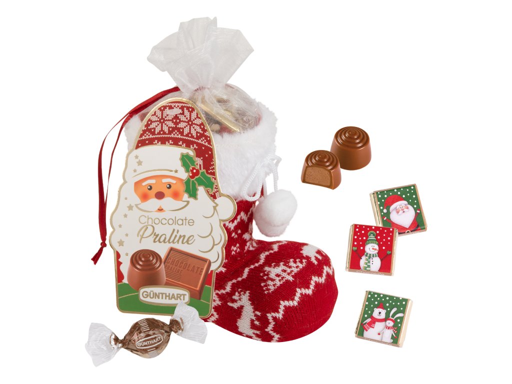 Mikulášova pletená ponožka plněná jemnou mléčnou čokoládou s nugátovou náplní a jemnými pralinkami v mléčné čokoládě plněné lískooříškovým nugátovým krémem.
