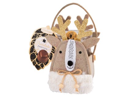 Jemné pralinky z mléčné čokolády plněné lísooříškovým krémem ve filcové kabelce ve tvaru vánočního sob.