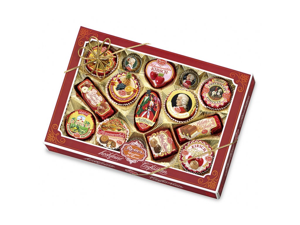 Obsah kakaové sušiny v hořké čokoládě nejméně 60%, v mléč-né čokoládě nejméně 35%. Složení: cukr, mandle, kakaové máslo, kakaová hmota, lískové oříšky, sušené plnotučné mléko,brandy-rozinky, laktóza, rum-rozinky, ananas, vaječný likér, invertní cukr, smetana, máslo, višňová marmeláda (obsah ovocné složky 50%, višňové pyré, cukr, glukózový sirup, želírovací přípravek Pektin, kyselící prostředek (kyselina citronová, citrát sodný)), smetana, višně, Cripsrýže (pšeničná mouka, cukr, ječný sladový výtažek, sůl), kandovaná pomerančová kůra, brandy, med, Vafle (pšeničná mouka, cukr, pšeničný škrob, máselný tuk, smetana, sušený žloutek, karamelový cukrový sirup, sůl, kypřící prostředek natriumbi-carbonat, Emulgátor: slunečnicový lecitin, přírodní aroma), Alkohol, Emulgátor: slunečnicový lecitin, pistácie, máselný tuk, sušený žloutek, kakaový prášek, višňovka, přírodní aroma (Rum, Višně, Pomeranč), zvlhčující prostředek (invertáza, glycerin), vaječný bílek, Grand Marnier, Rum, kyselící prostředek: kyselina citronová. Skladovat v suchu a chladu. Může obsahovat stopy sóji.