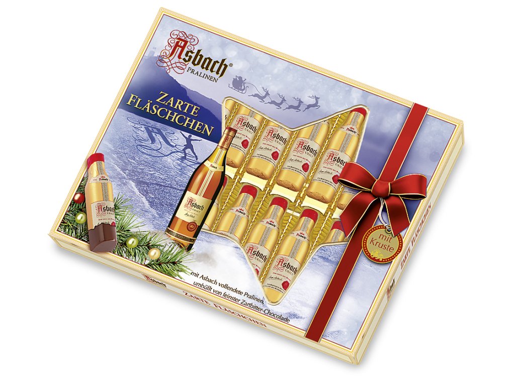 Lahvičky plněné světoznámou jemnou brandy Asbach (20 kusů), uvnitř cukrové krusty a jemné hořko-sladké čokolády,