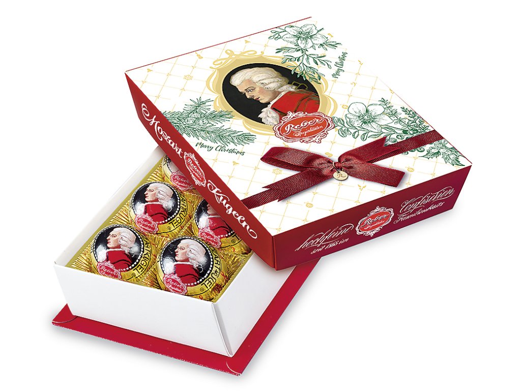 Vánoční balení Baroko se 6 pravými Reber Mozartovými koulemi (Mozart Kugeln) špičkové kvality s jemným lískooříškovým nugátem, nejvyšším podílem marcipánu (mandlový a pistáciový) a dvěma vrstvami alpské čokolády - jemné mléčné a výrazné hořké. S odstranitelnou vánoční kartou. Bez použití konzervantů a chemických barviv. Vše v košer (kosher) kvalitě.