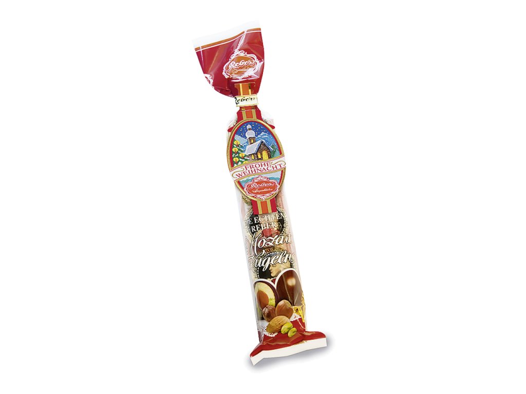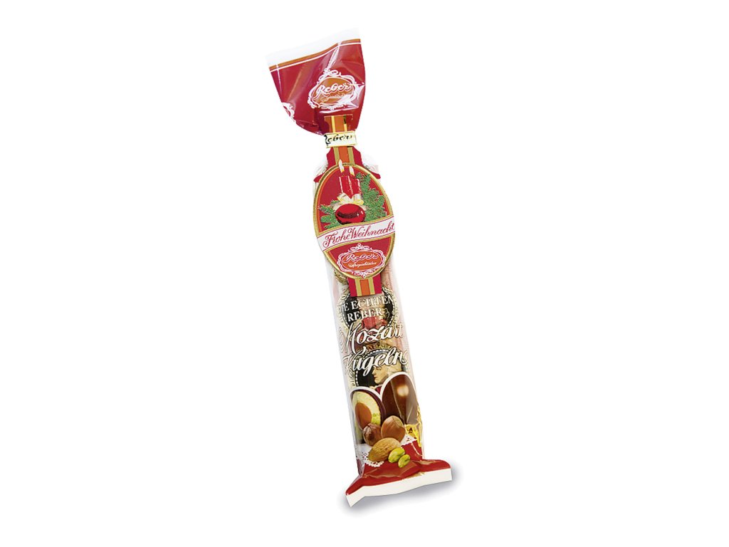 Sáček s 5 pravými Reber Mozartovými koulemi s vánočním motivem. Naše Mozartovy koule, chcete-li Mozart Kugeln, jsou bez chemických konzervačních látek a barviv a v košer (kosher) kvalitě.