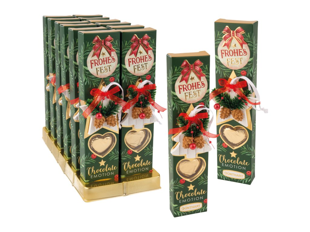 Nugátové pralinky z mléčné čokolády plněné nugátovým krémem ve vánočním balení s visačkou.