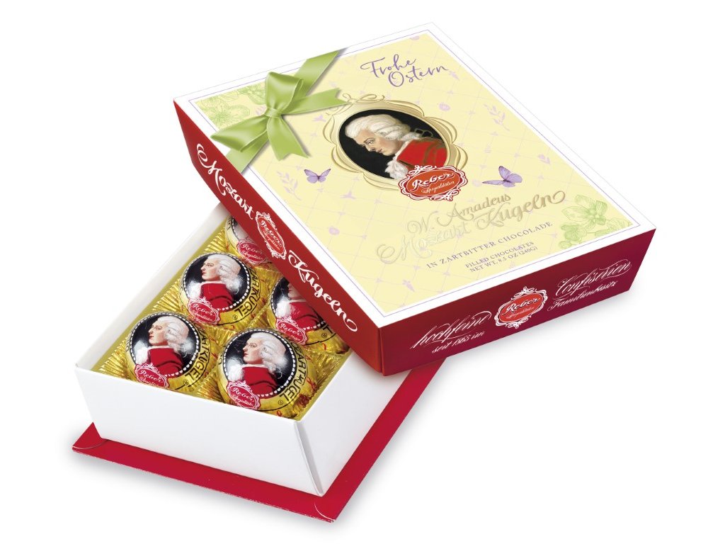 Velikonoční balení Baroko se 6 pravými Reber Mozartovými koulemi (Mozart Kugeln) špičkové kvality s jemným lískooříškovým nugátem, nejvyšším podílem marcipánu (mandlový a pistáciový) v Mozartových koulích a dvěma vrstvami alpské čokolády - jemné mléčné a výrazné hořké. S odstranitelnou velikonoční kartou. Bez použití konzervantů a chemických barviv. Vše v košer (kosher) kvalitě.